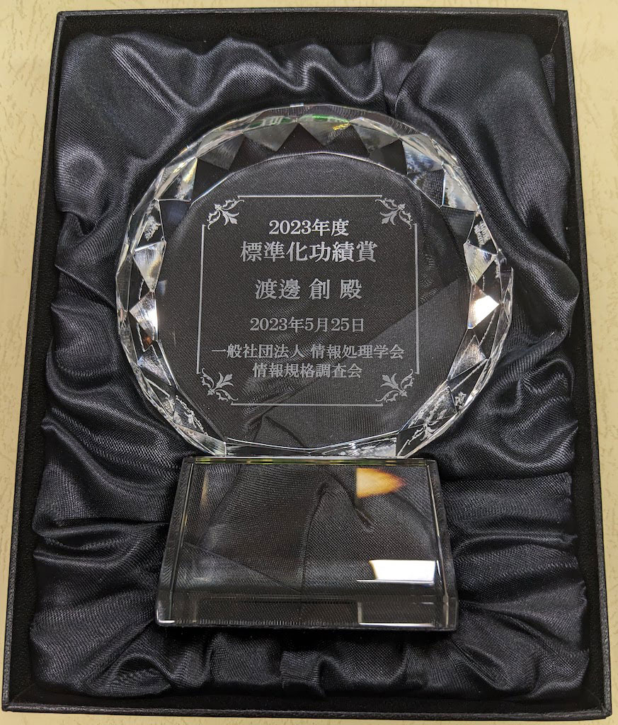 2023年5月25日に開催された、一般社団法人 情報処理学会 情報規格調査会 第38回規格総会において、渡邊創副研究センター長が、2023年度 標準化功績賞を受賞しました。標準化功績賞は、情報技術の標準化に関し、長年にわたり情報規格調査会に所属する委員会の委員等として多大の功績があったと認められる者のなかから、毎年原則として 3名以内を選定して贈呈されるものです。